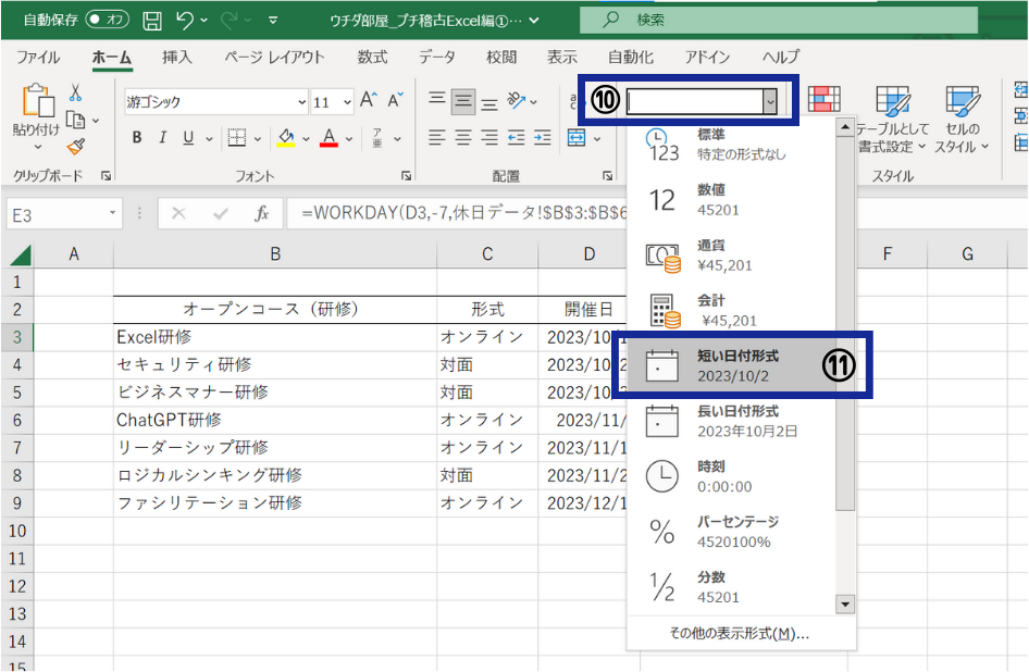 ⑪今回は、表示された書式の中から「短い日付形式」を選択します。