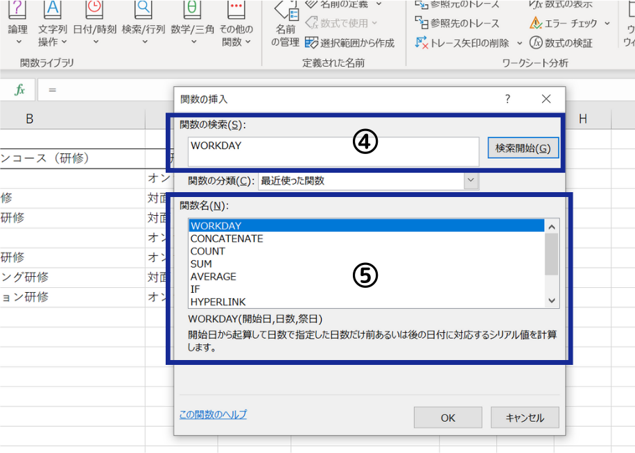 ⑤関数名欄に検索候補の関数が表示されます。「WORKDAY」を選択し、下のOKボタンをクリックします。