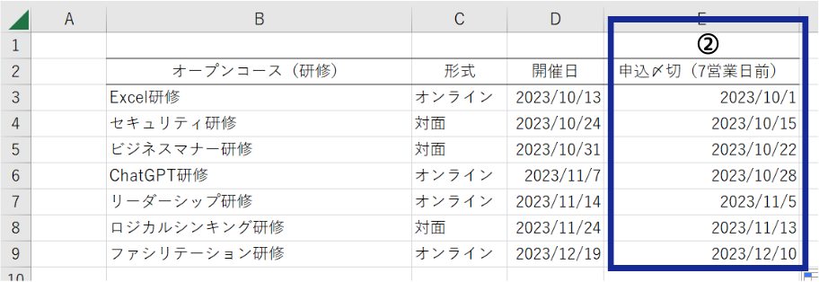 書式を修正してオートフィルで各研修の申込〆切を入力してみましょう。