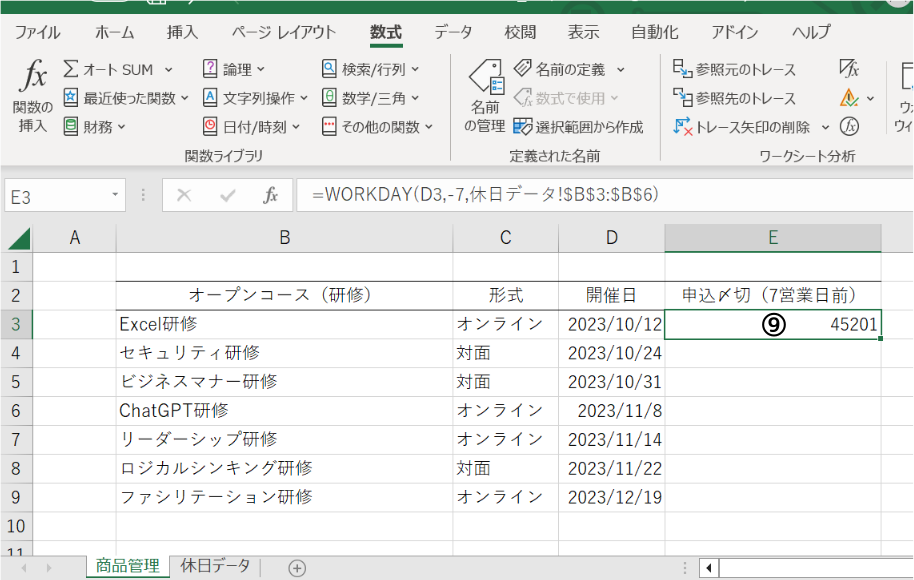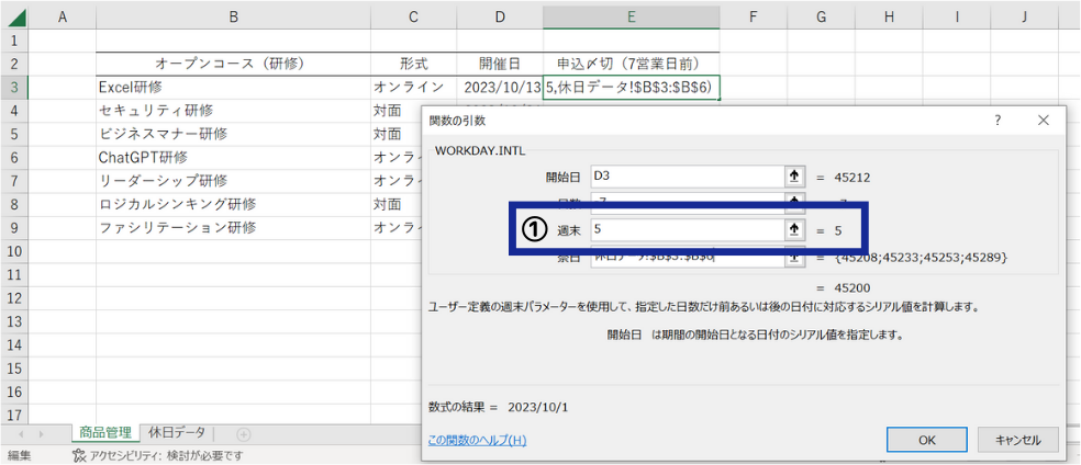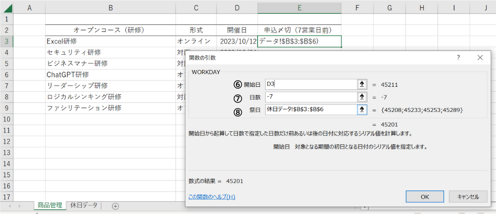 今回は各研修の申込〆切日を管理したいので、「開始日」には開催日、「日数」には7、「祭日」にはWARM UPで作成した休日データを入力します。