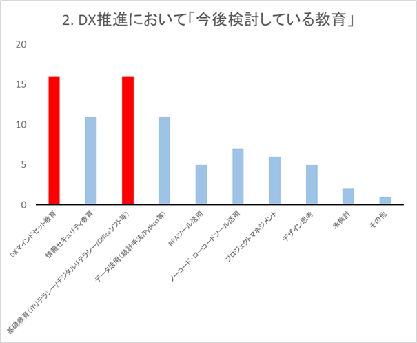 続いて、DX推進において「今後検討している教育」で一番多かった投票は、同順で「DXマインドセット教育」と「基礎教育(ITリテラシー/デジタルリテラシー/Officeソフト等)」で16票でした。2位も同順で「情報セキュリティ教育」「データ活用(統計手法/Python等)」で11票と続いています。