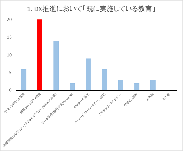 DX推進において「既に実施している教育」で一番多かった投票は「情報セキュリティ教育」で20票でした。そのあとは、「基礎教育(ITリテラシー/デジタルリテラシー/Officeソフト等)」で14票、「RPAツール活用」9票と続いていました。