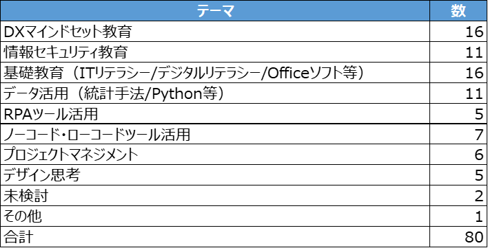 表1 DX推進において「既に実施している教育」のテーマと回答数