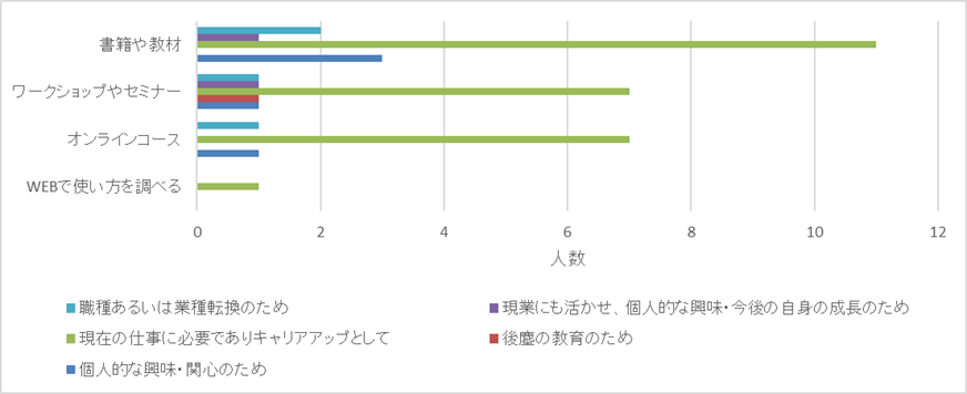 学習形式では、書籍や教材が最も多く、次いでワークショップ・セミナーといった学習形式が選ばれる傾向が見られました。