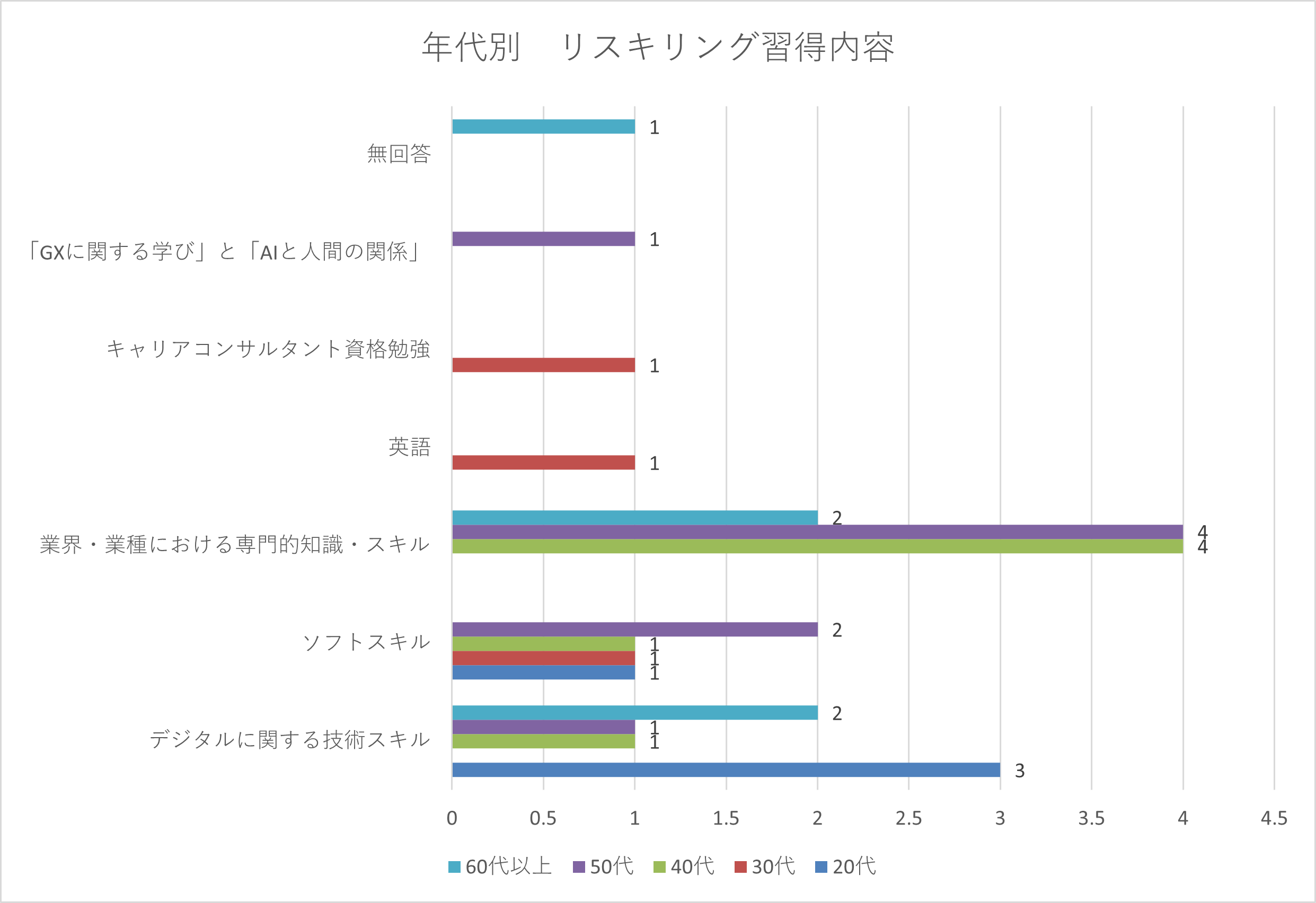 20代においては、「キャリアアップ」を目指す動機が強いですが、30代以降では、それぞれの選択肢にまんべんなく点在しており、個人的な興味や自己成長を目的としたリスキリングを選択している様子もうかがえます。語学や資格取得他、仕事の延長線上で自分の成長や生活の充実を図る動きが散見されます。推測としては、職場での役割がある程度固まっている層が、キャリア後半を見据えて新たな興味分野に時間を割く、といった背景もあるのではないかと考えています。